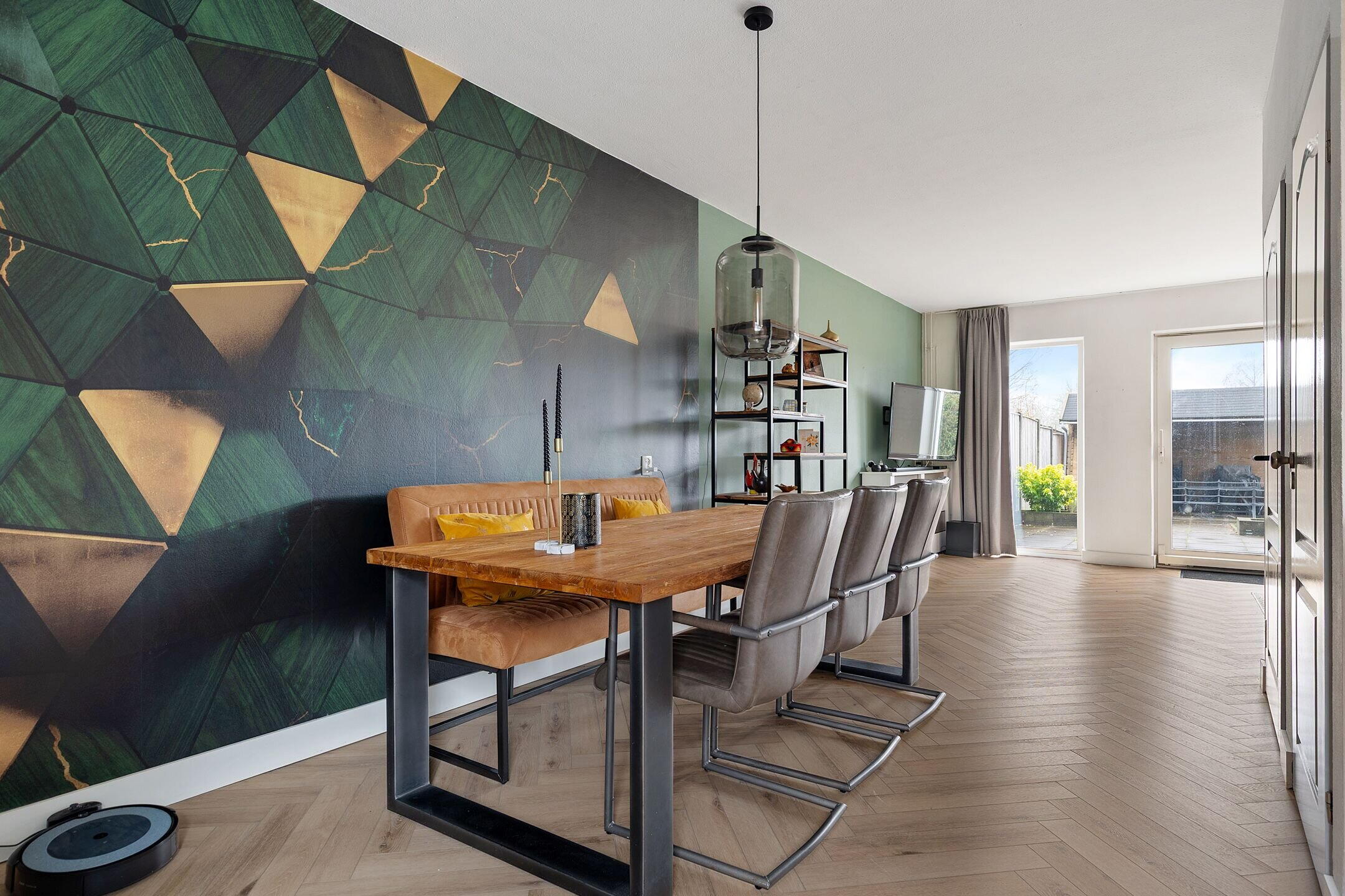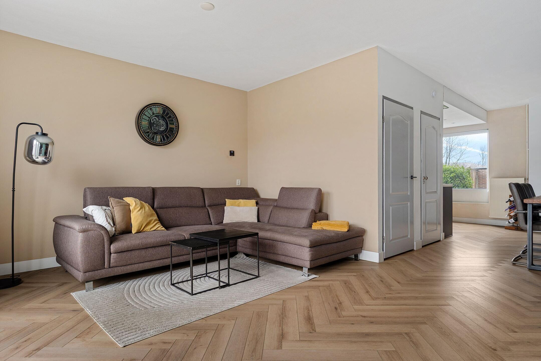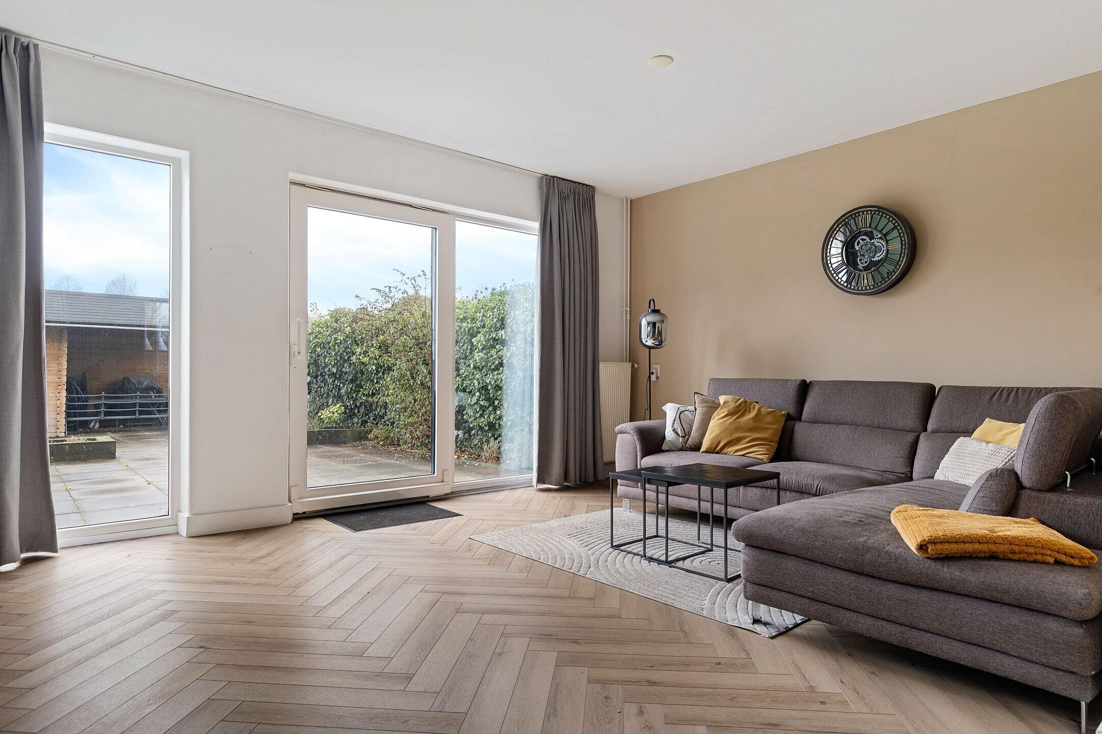 De tuingerichte woonkamer heeft een fijne indeling zodat er royaal plek is voor een eettafel en een zithoek. De schuifpui geeft toegang tot het verzorgde terras en de tuin. Via een tussenhal (met naastgelegen vaste voorraad kast in de woonkamer) is er toegang tot het toilet en de trapopgang naar de 1e verdieping.
