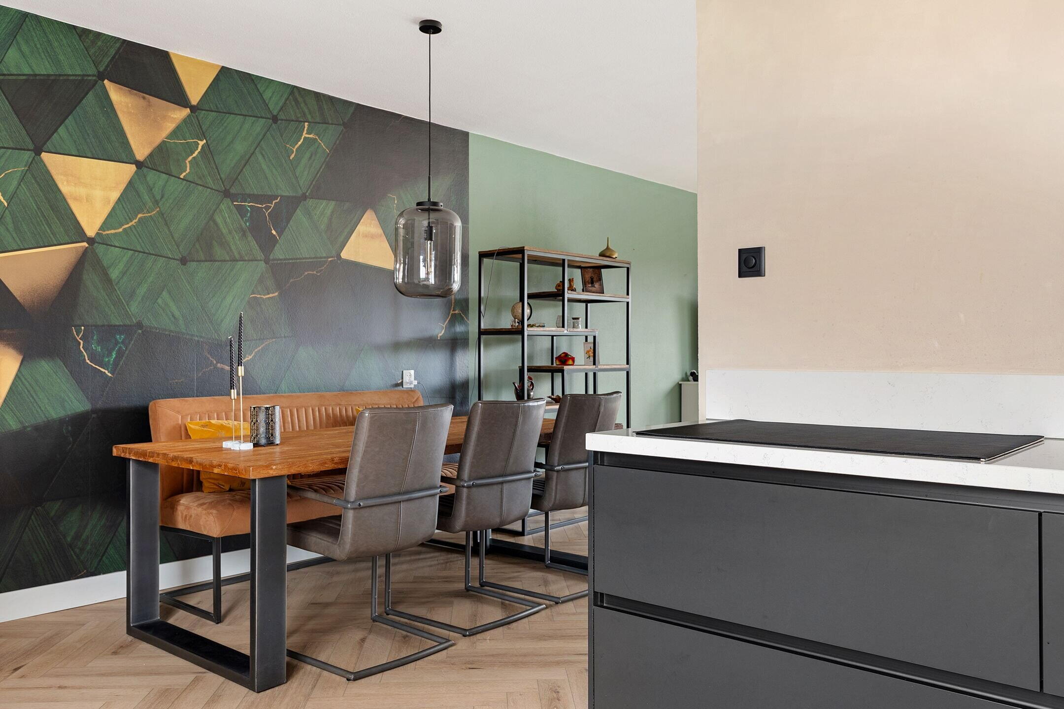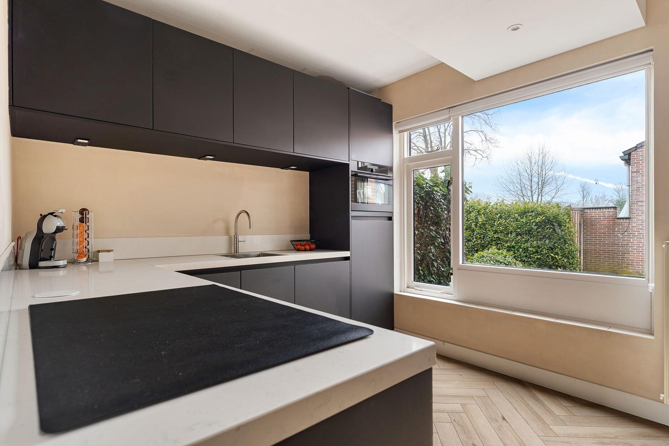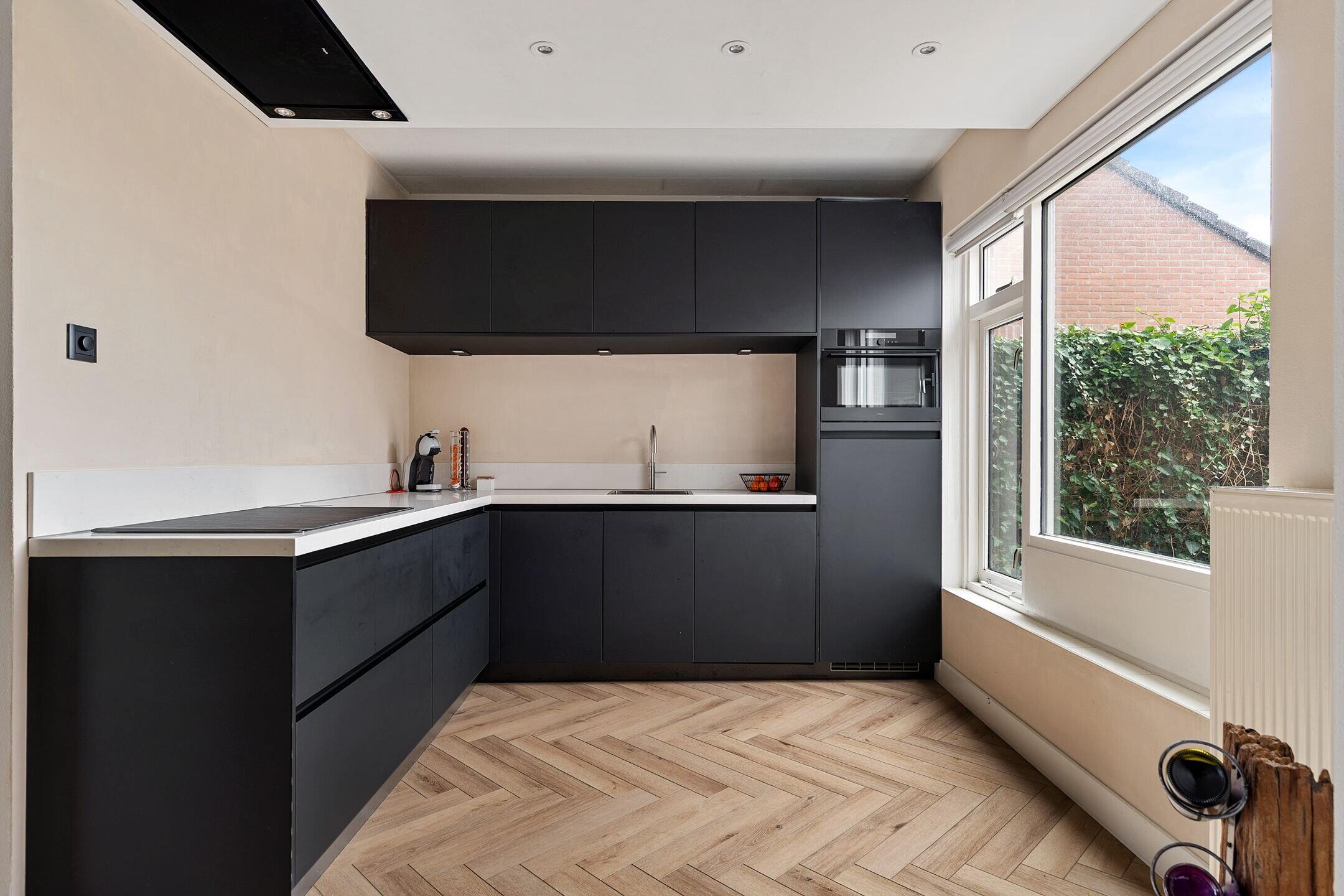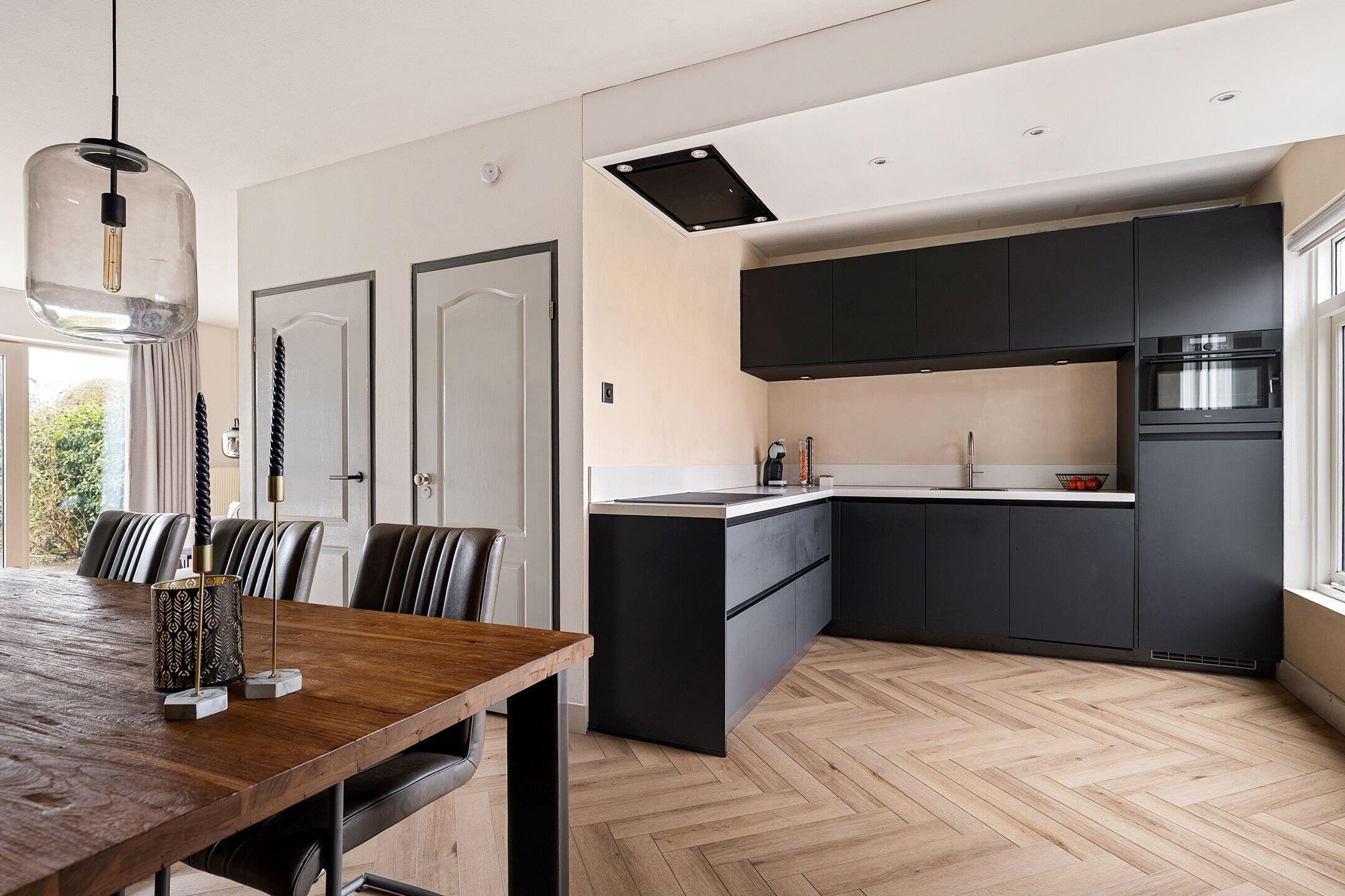 Entree met hal, meterkast en toegang tot de aangebouwde berging/bijkeuken of de L-vormige woonkamer met moderne visgraad PVC vloer en open keuken. De keuken (2022) in hoekopstelling is uitgevoerd met een 5-pits inductie kookplaat met afzuigkap verwerkt in het plafond, vaatwasser, koelkast, combi magnetron en een Quooker kraan.