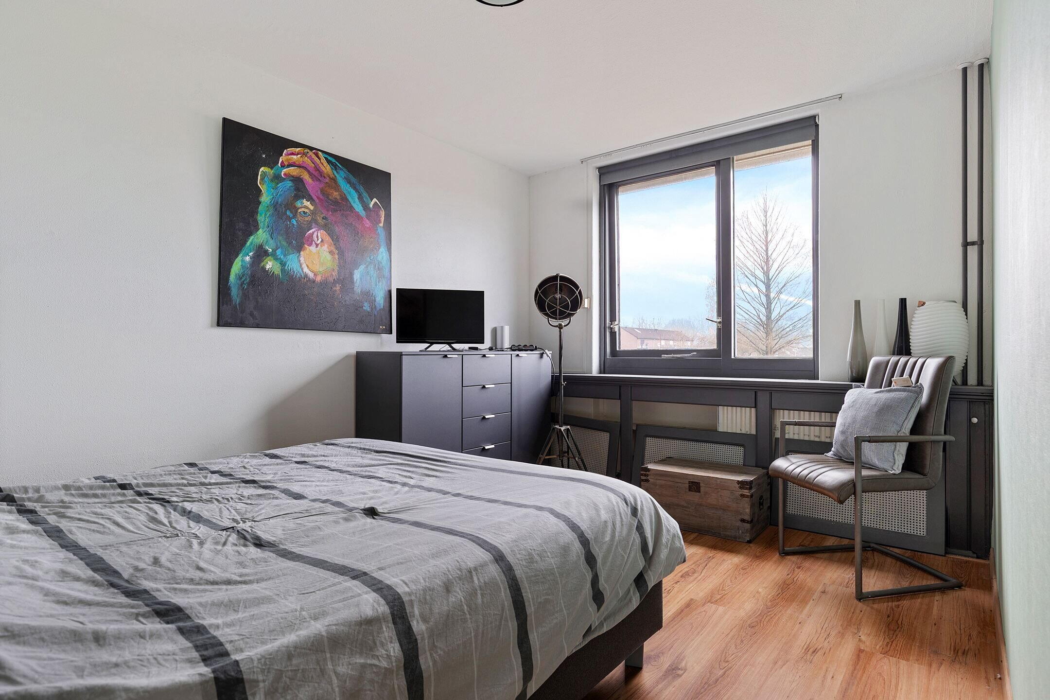 Overloop met trapopgang naar de 2e verdieping, 3 slaapkamers en de badkamer (2022) met wastafelmeubel, inloopdouche, bubbelbad en tweede toilet. De "master" slaapkamer is royaal qua maatvoering en is verbonden met de ruimte boven de berging. Hier bevindt zich tevens de CV ketel en de omvormer voor de zonnepanelen. De slaapkamers aan de achterzijde van de woning zijn voorzien van elektrisch bedienbare rolluiken.