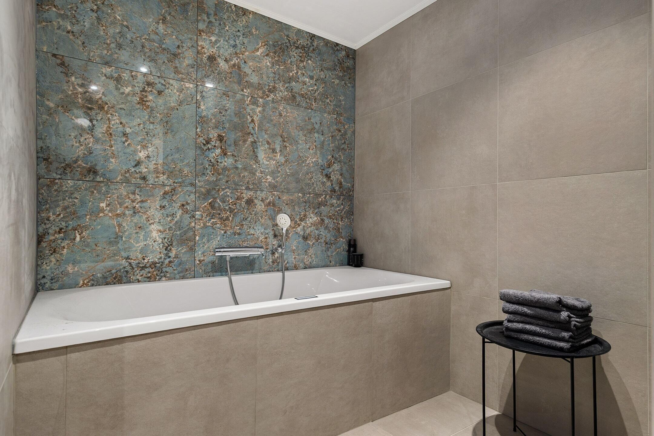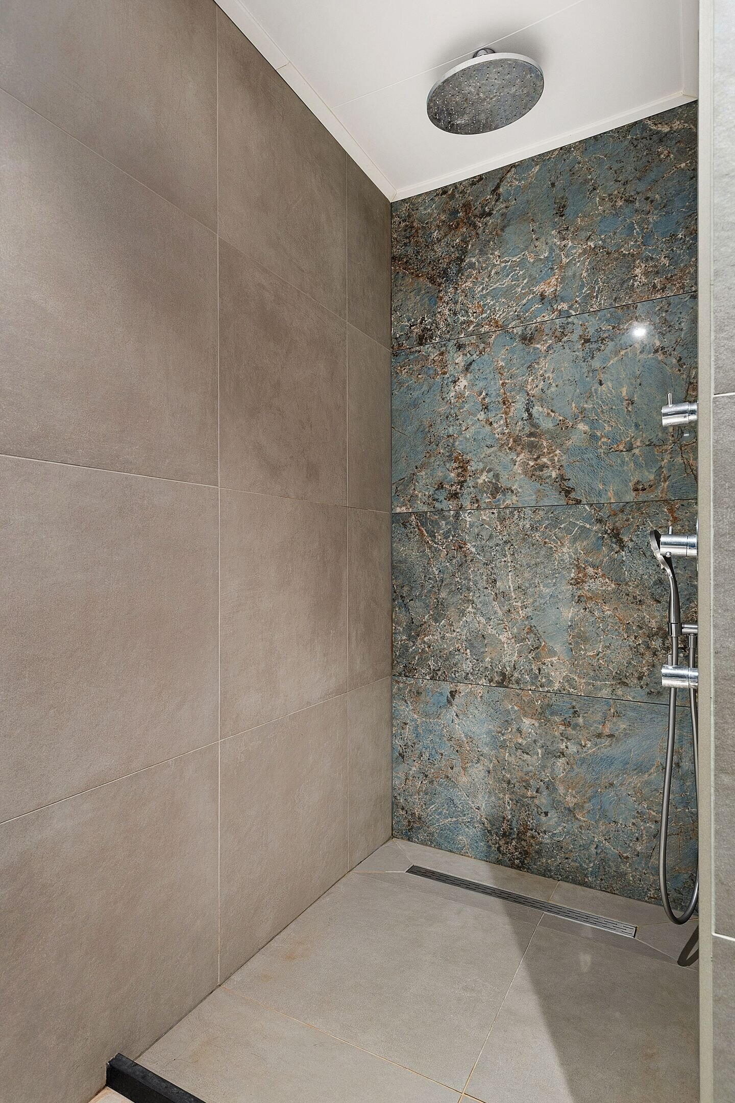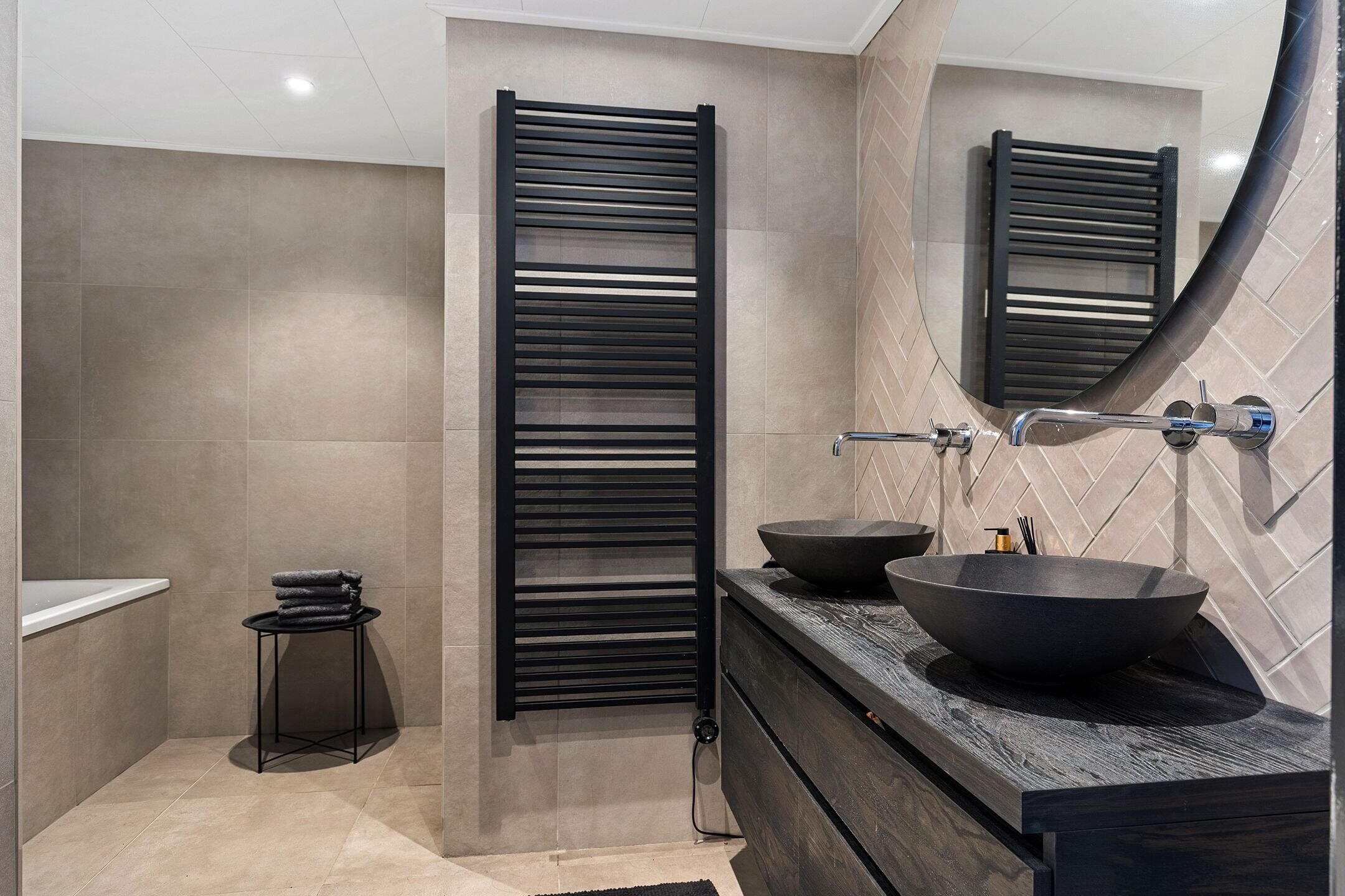 - Dubbele wastafel, inloopdouche, toilet, en whirlpool
