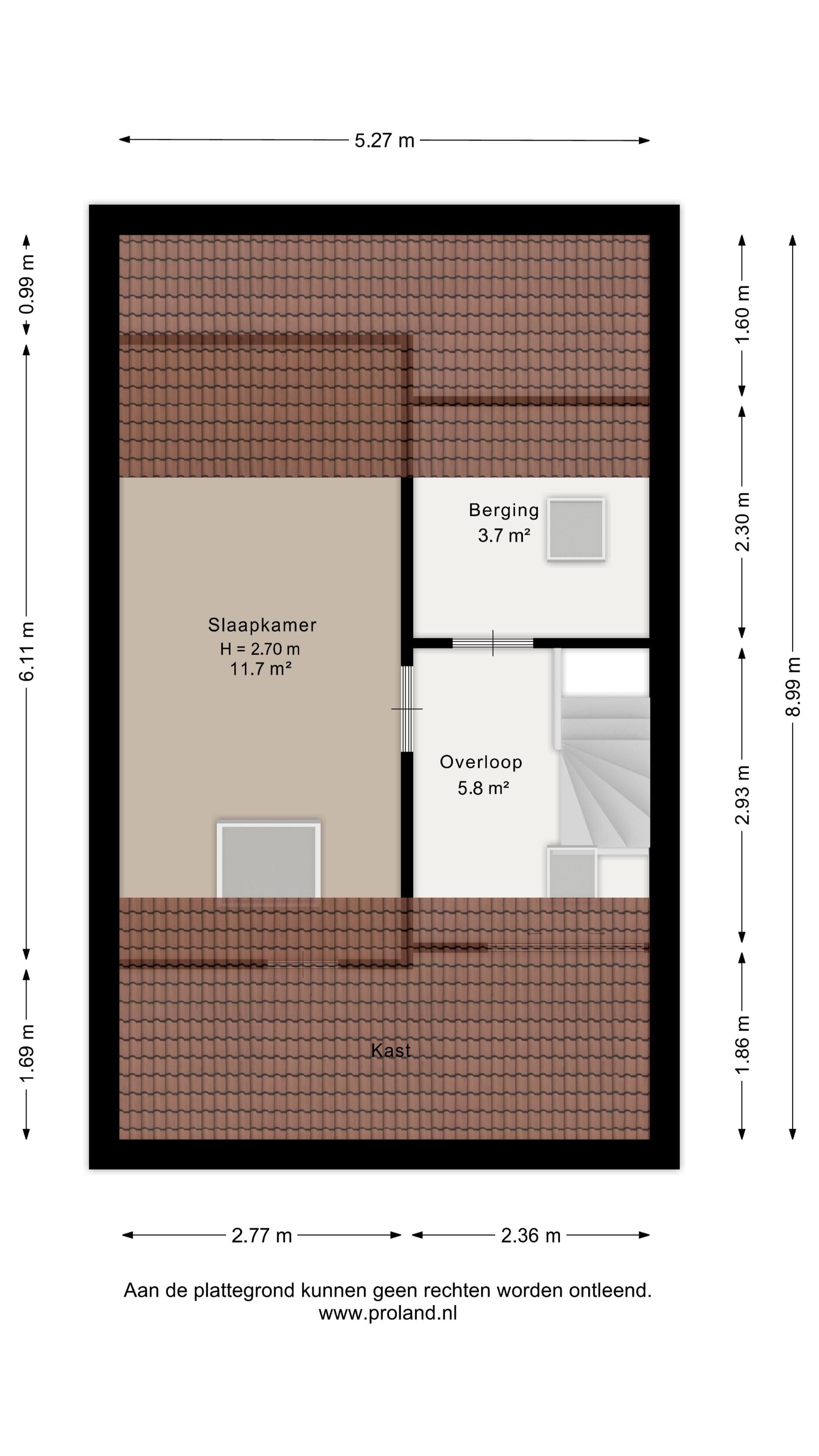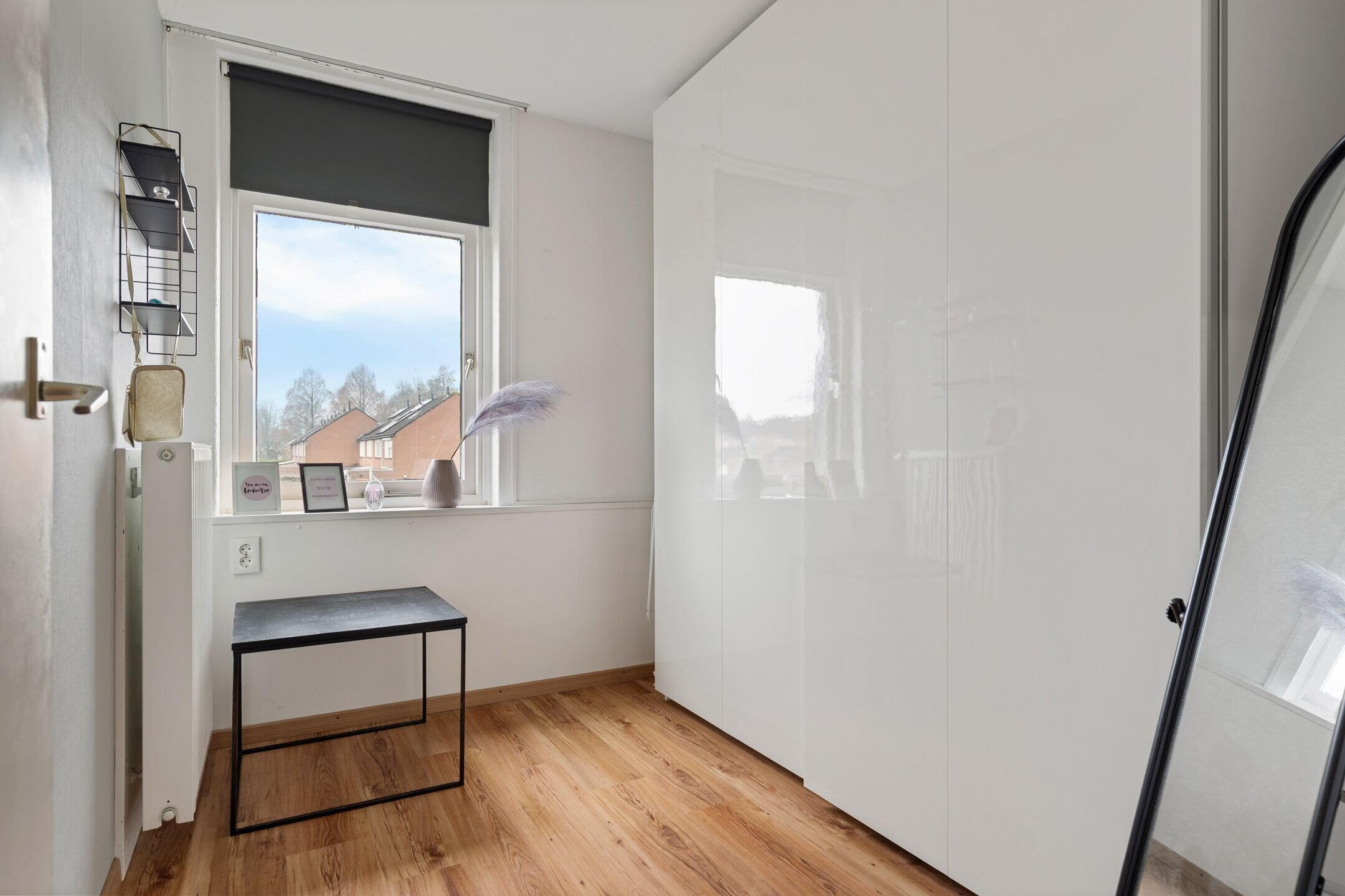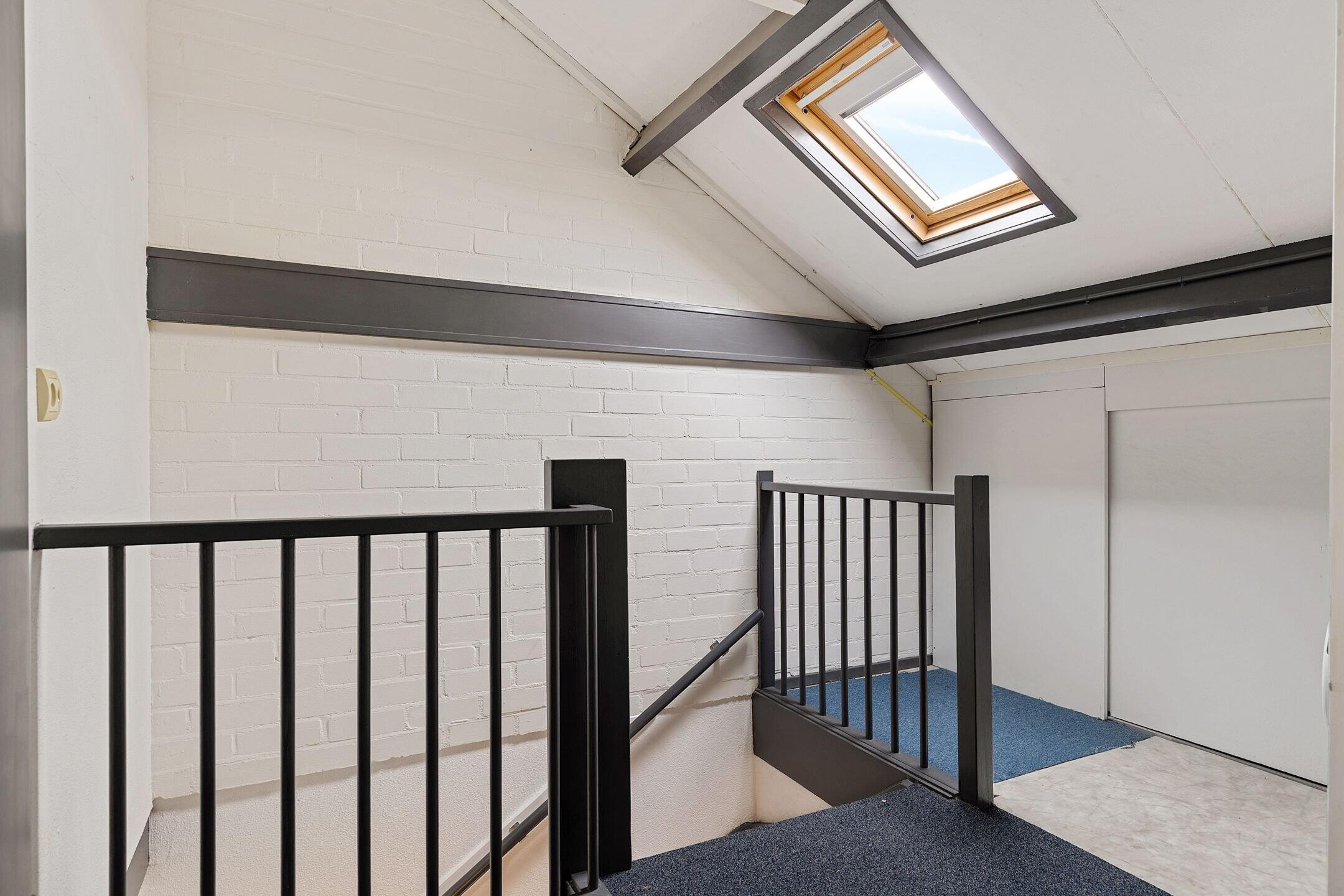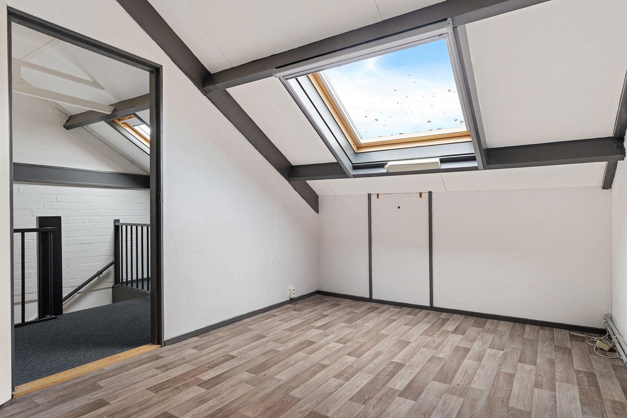 Een verzorgde zolderruimte met opbergruimte achter de knieschotten, witgoedopstelling en een 4de slaapkamer met dakraam.