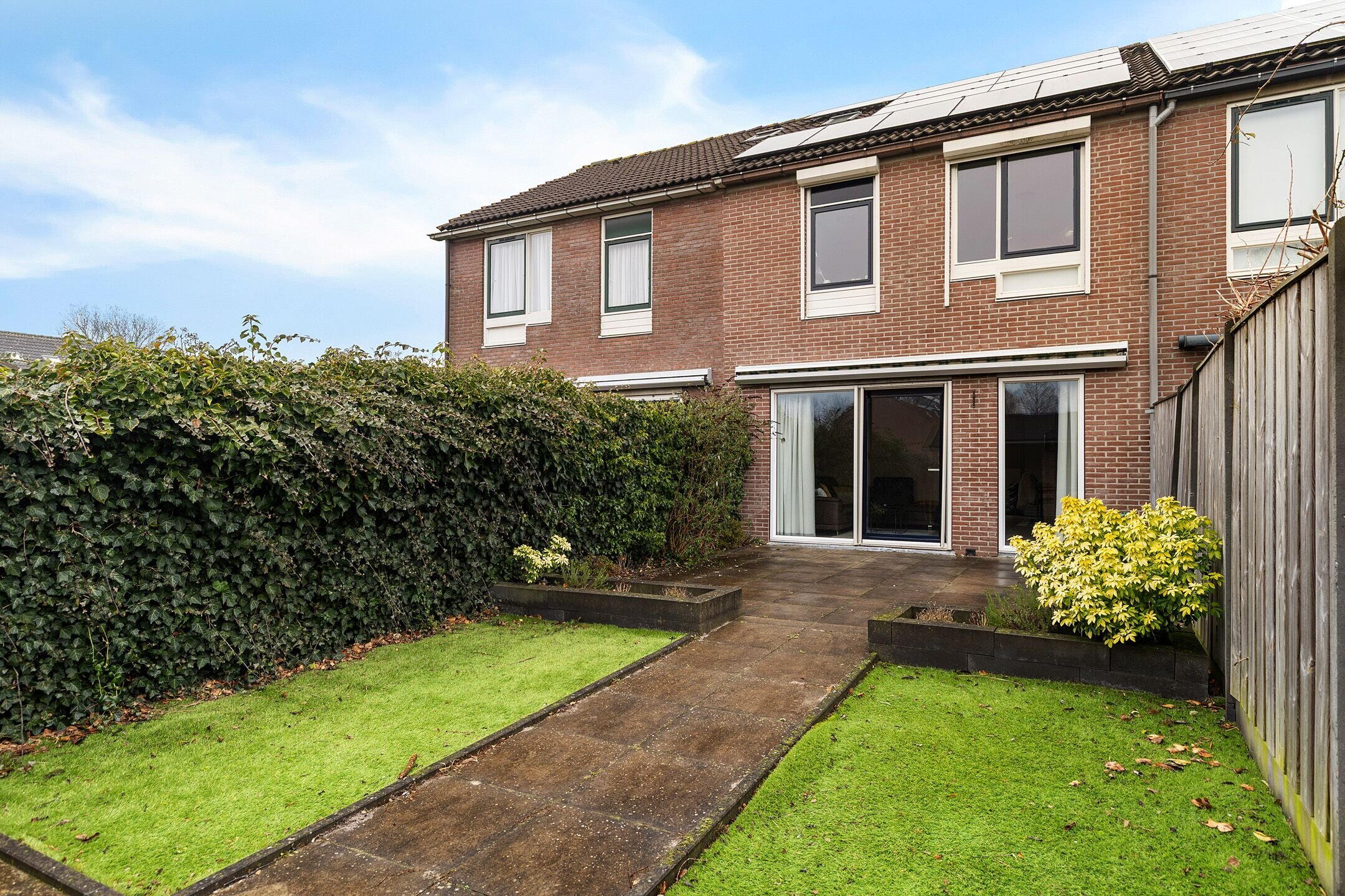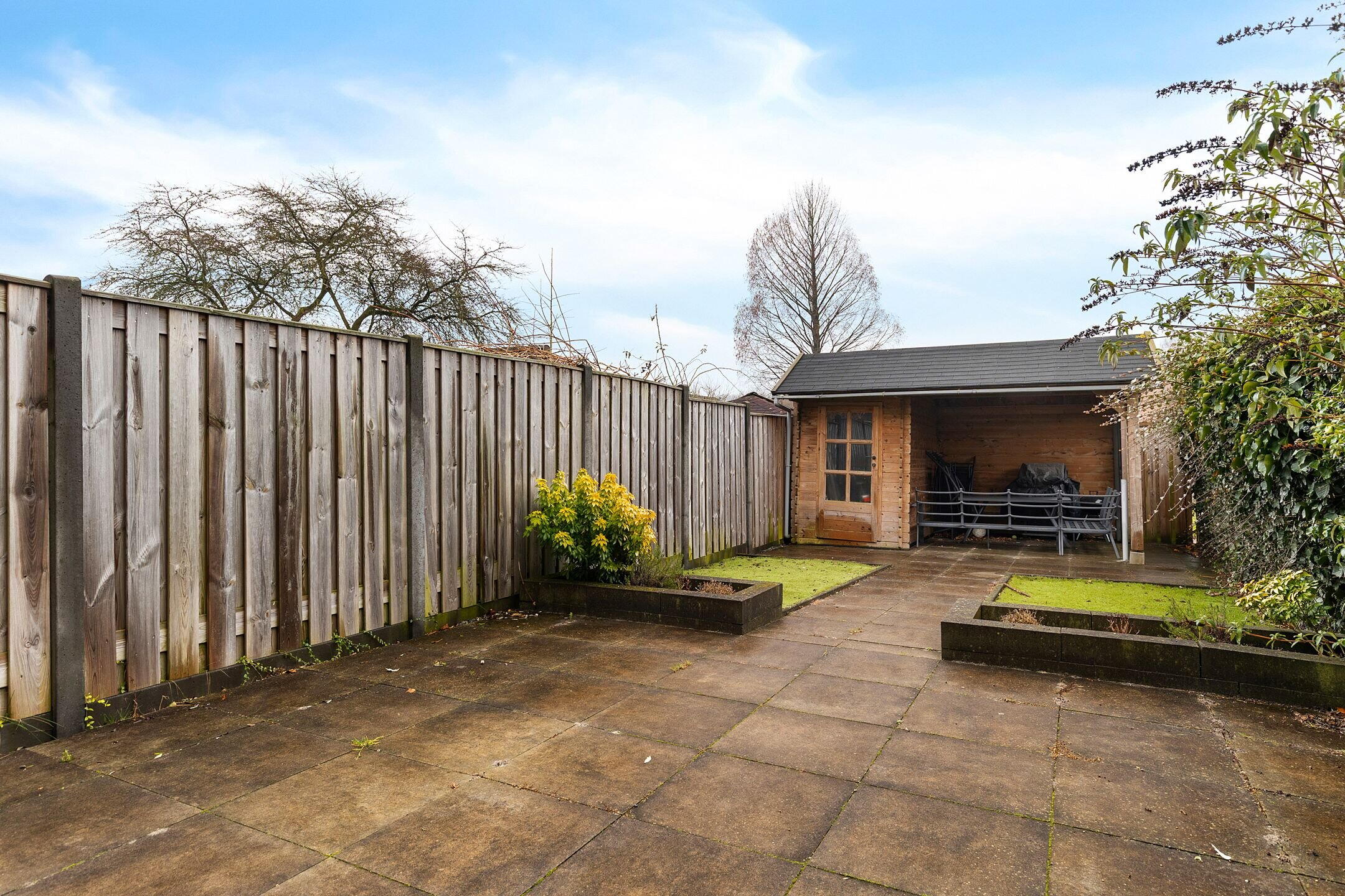 De achtertuin op het Zuiden is voorzien van een royaal terras, sfeervolle borders met beplanting en een vrijstaande houten schuur met overkapping. De tuin is bereikbaar via een praktische achterom en grenst direct aan het achtergelegen grasveld met speeltoestellen. Dankzij deze vrije ligging biedt de tuin veel privacy.